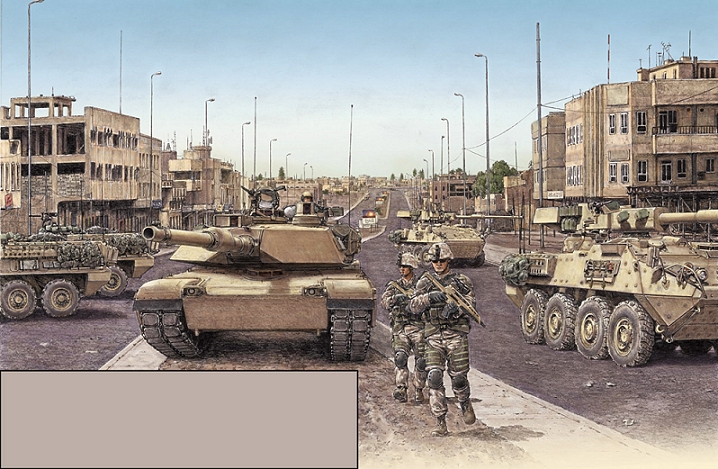 A look at the transforming U.S. Army ground forces, as they may appear by 2007. Note the soldier's additional body armor and weapon, also the deployment of the Stryker 105mm mobile gun system (MGS). (ARMOR Magazine cover art.)