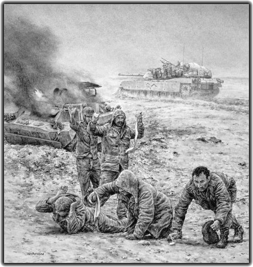 Iraqi soldiers surrender to allied forces after fleeing their burning APC, with a mine-plow equipped M1A1 Abrams in the background. |