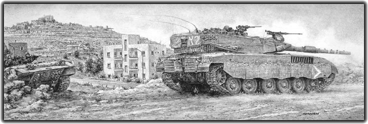 A depiction of the ambush attack on advancing Israeli Merkava 2 tanks by well positioned Hezbollah fighters firing Russian made Kornet AT missiles, during what became known as the battle of Wadi Saluki in August of 2006. |