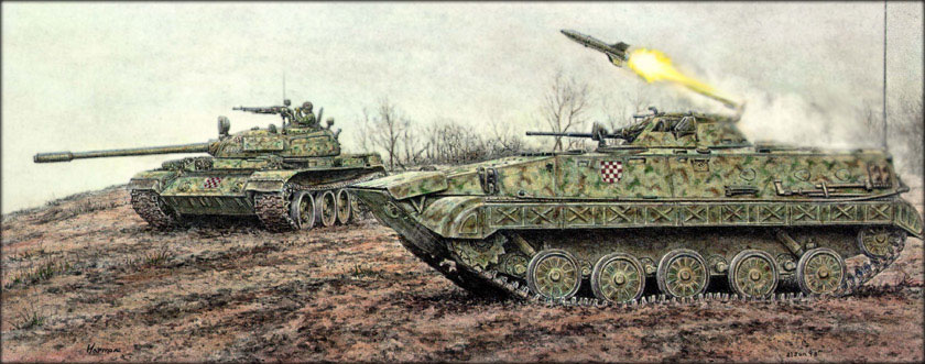 Croatia, 1991. A Croatian BVP M-80A armored personnel carrier and a Soviet-made T-55, part of a counterattack against Serb Tanks. |
