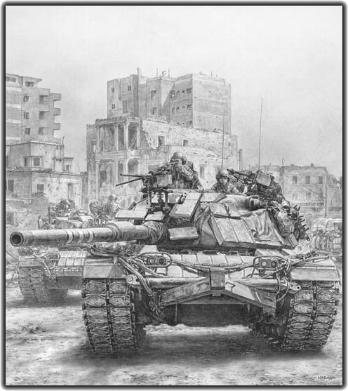 A British-built Centurion of the Iranian Army engages attacking Iraqi armor in the city of Khorramshahr, 1980. |