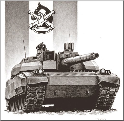 A rendering that shows the last millisecond before the impact of a tank-launched prototype "top attack" smart missile. The unsuspecting crew resides in a Russian T72, equipped with reactive (outwardly exploding) armor blocks covering most vulnerable surfaces. |