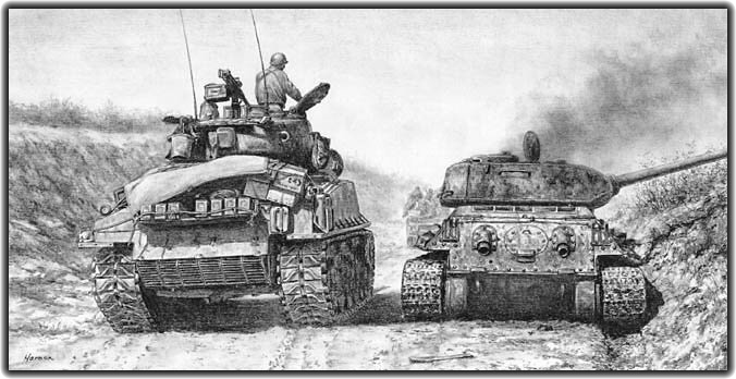 A late-model Sherman M4A3, mainstay of U.S. forces in Korea, moves down a road past a knocked-out North Korean T34/85.