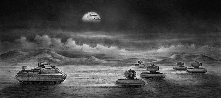 A "could happen" kind of scene...missile-armed robotic mini tanks head out to detect the enemy, remotely directed by the safely deployed, crew-served controller vehicle.