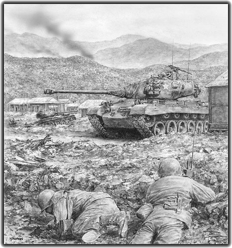 Korea, 1952: Amongst the ruins of a Korean village, an M26 Pershing enters the scene, to the relief of some shell-shocked U.S. troops.