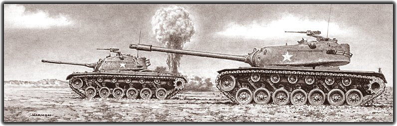 Typical of U.S. tank designs in the 1950s, an M48 Patton and an M103 heavy tank are portrayed in a theoretical test area scene with a low-yield nuclear detonation in the background.