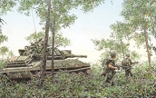 Advancing 11th ACR soldiers, accompanied by an M551 Sheridan tank. (enlarged as a mural at the Patton Museum)