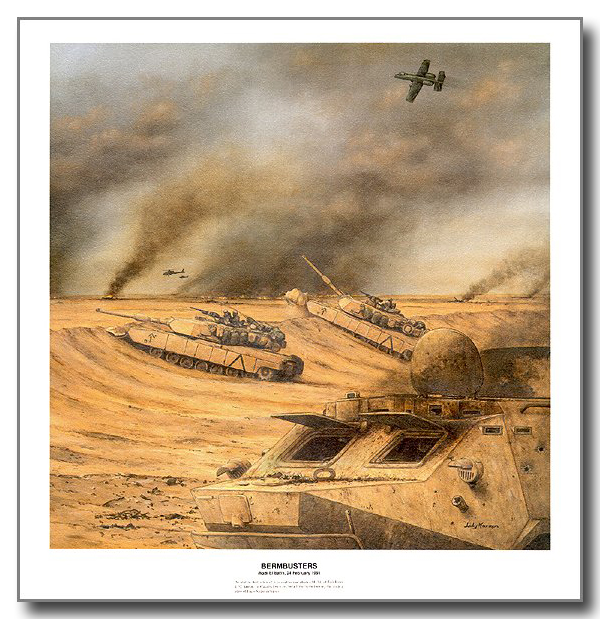 "BERMBUSTERS" Wadi El Batin - 24 February 1991. Amidst the destruction of prior coalition airstrikes, M1A1s of Task Force 1-32 Armor, 1st Cavalry Division, breach the berm forming leading edge of Iraq's border defenses.